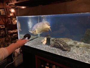 このアロワナさん、人に興味を向けることが多いそうで、マイクを向けてみました!